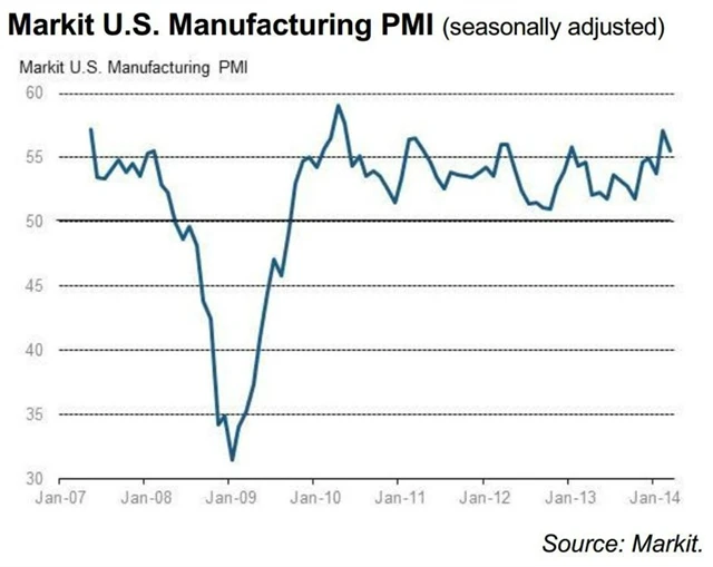 Index se rovněž udržel nad lednovou úrovní 53,7 bodu. To je podle hlavního ekonoma společnosti Markit Chrise Williamsona další známkou toho, že zpracovatelský sektor již překonal slabost, která byla důsledkem nepříznivého počasí na začátku roku.
