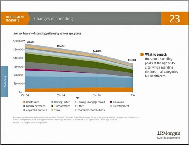 Podle dat amerického statistického úřadu zpracovaných JPMorgan Asset Management, kulminují výdaje průměrné americké domácnosti ve věku 45 let. Jak ukazuje následující graf, výdaje obyvatel starších než 45 let klesají.