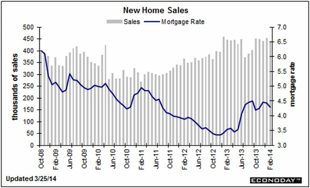 Prodeje nových domů ve Spojených státech v únoru meziměsíčně klesly o 3,3 % na pětiměsíční minimum 440 tisíc jednotek anualizovaně. Podle průzkumu agentury Bloomberg se čekal pokles na 445 tisíc jednotek. Data za leden byla výrazně revidována na +3,2 % (455 tisíc jednotek anualizovaně) z +9,6 % (468 tisíc jednotek anualizovaně).