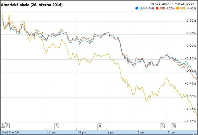 Dow odepsal 0,60 %, S&P 500 se v průběhu dne pohyboval jen tři body pod rekordem, ale nakonec ztratil 0,70 % a Nasdaq klesl o 1,43 %. Investory znejistily poznámky prezidenta Obamy o tom, že mezinárodní pořádek prochází zkouškou a Spojené státy s Evropskou unií budou koordinovat svůj postup ohledně dalších sankcí.