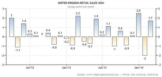 Maloobchodní tržby ve Spojeném království v únoru vzrostly meziročně o 3,7 % po +3,9 % v lednu. Očekával se 2,9% růst. Meziměsíčně v únoru tržby maloobchodníků vzrostly o 1,7 % (odhad: +0,5, leden -2 %). Bez zahrnutí aut meziměsíčně vzrostly o 1,8 % (odhad: +0,3 %).