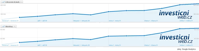 Graf vývoje všech důležitých parametrů návštěvnosti webu připomíná býčí trh, který však pro svoje pokračování potřebuje v reálném burzovním světě objemy obchodů. V mediálním světě je pro "udržitelnost růstu" například důležitý váš čas strávený na našich stránkách. A na našem webu trávíte v průměru nejdelší čas ve srovnání s dalšími investičními portály (cca 7 minut). Také loajalita návštěvníků dosahuje silně nadprůměrných hodnot, když se 70 procent návštěvníků na stránky Investičního webu pravidelně vrací.