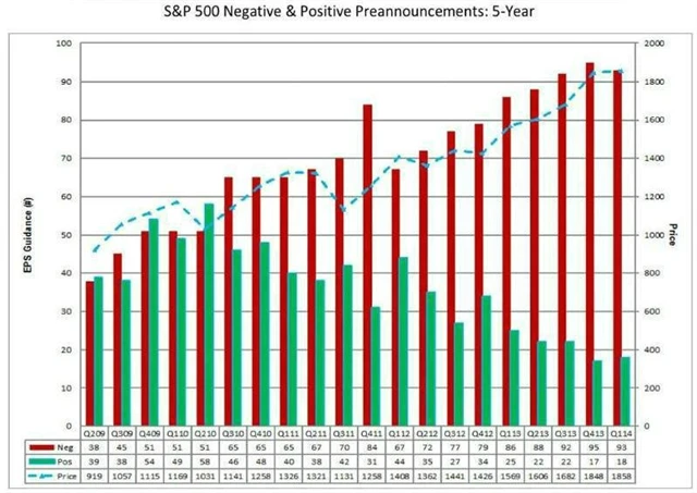 Skončilo první čtvrtletí, během něhož se firmy předháněly ve zveřejňování negativních predikcí svých výsledků. Snižovaly očekávání kvůli řadě faktorů, mnohé z nich kvůli tvrdé zimě. "Pro první kvartál roku 2014 vydalo 93 firem z indexu S&P 500 negativní výhled zisku a jen 18 pozitivní," říká John Butters z FactSet.