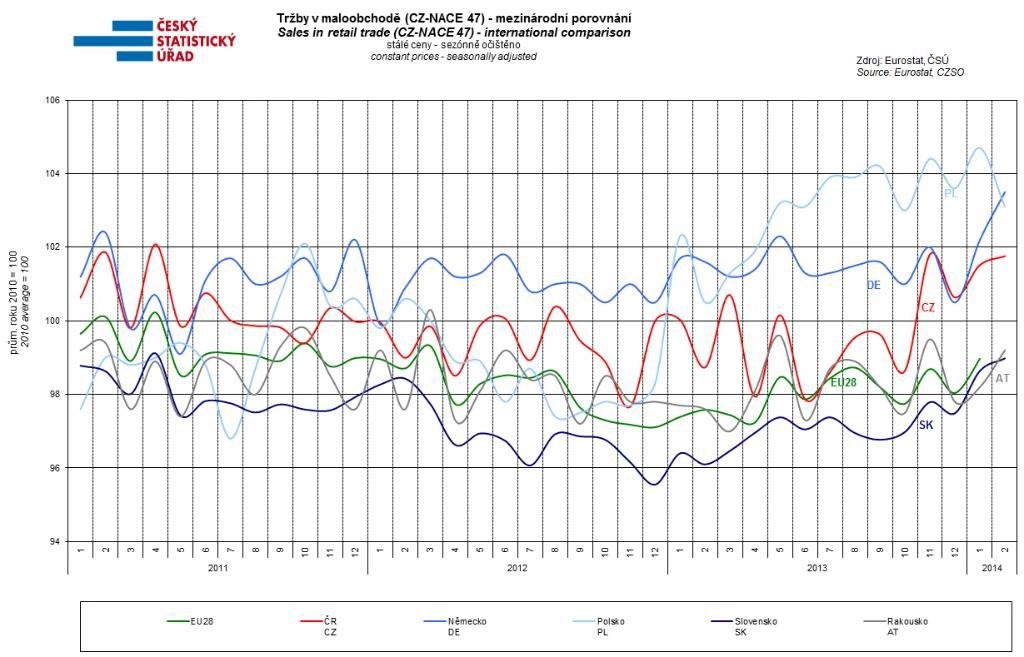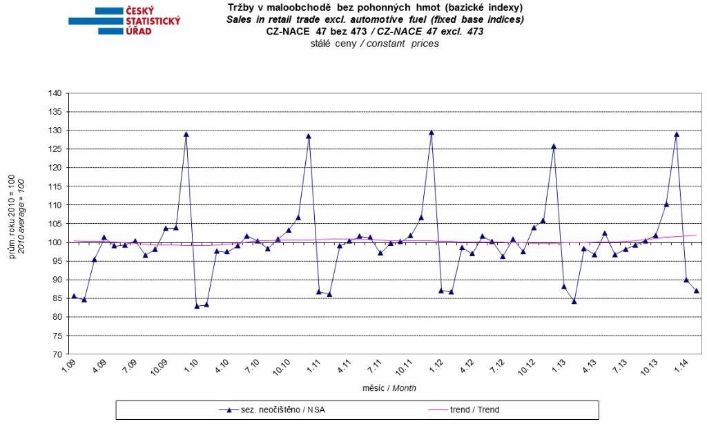 Tržby v maloobchodě v České republice včetně motoristického segmentu po očištění o sezónní vlivy vzrostly v únoru reálně meziměsíčně o 0,3 % a meziročně se po očištění o vliv počtu pracovních dní zvýšily o 8,1 %, stejně jako bez očištění. Růst tržeb, započatý v listopadu 2013, tak pokračoval již čtvrtým měsícem v řadě. Uvedl to v pátek Český statistický úřad (ČSÚ).