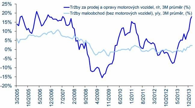 "Hlavním motorem růstu maloobchodu je motoristický segment, respektive prodeje aut," uvedl Petr Dufek z ČSOB. "Otázkou nicméně je, kolik prodaných aut skutečně směřuje na český trh, respektive jaký podíl tvoří nákupy tuzemských zákazníků, a kolik jde z titulu levné koruny na vrub nákupům zahraničních spotřebitelů," dodal. "Evropa se potýká s přebytkem produkčních kapacit, což se promítá i do dlouhodobého vývoje cen v motoristickém segmentu. Tuzemské prodeje navíc podpořila i slabá koruna, která zlevnila nákupy zahraničních zákazníků."