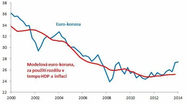 Koruna je slabší než by měla být (euro-koruna modelovaná rozdílem v růstu HDP a inflace)