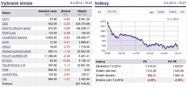 České akcie v úterý zlevnily, index PX spadl pod tisíc bodů