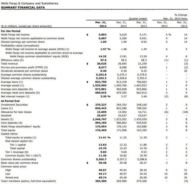 Wells Fargo, nejvýdělečnější americká banka roku 2013, v pátek zveřejnila hospodářské výsledky za první čtvrtletí 2014, které předčily očekávání trhu. Její čistý zisk vzrostl o 14 % na 5,89 miliardy dolarů (1,05 USD na akcii) z 5,17 miliardy (92 centů na akcii) v předchozím roce. Výnosy naopak klesly o 3 % na 20,63 miliardy.