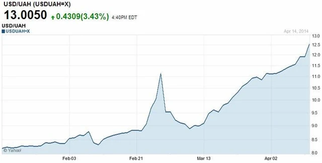 Hřivna od začátku letošního roku kvůli konfliktu s Ruskem ztratila vůči dolaru téměř 38 % hodnoty.