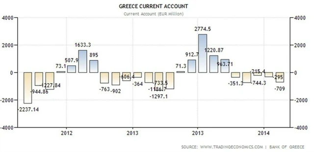 Deficit běžného účtu Řecka se v únoru rozšířil na 709 milionů eur z lednových 295 milionů eur. V únoru 2013 byl na 684 milionech eur.