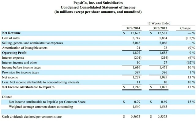 Čisté tržby společnosti PepsiCo v prvním čtvrtletí letošního roku meziročně vzrostly na 12,62 miliardy dolarů z 12,58 miliardy v předchozím roce. Provozní zisk se zvýšil o 9 % na 1,807 miliardy dolarů z 1,658 miliardy a zisk před zdaněním o 10 % na 1,616 miliardy dolarů z 1,471 miliardy dolarů v prvních třech měsících loňského roku. Čistý zisk vzrostl o 13 % na 1,2 miliardy dolarů z 1,08 miliardy v předešlém roce.