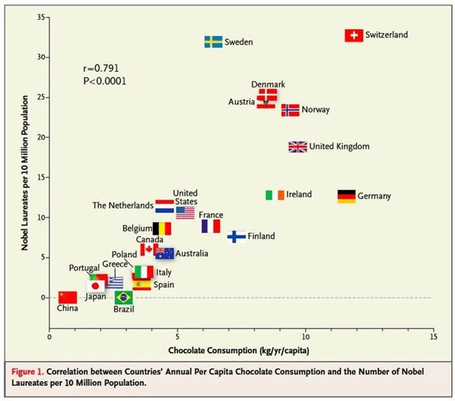 Země, které spotřebují nejvíce čokolády, mají i nejvíce laureátů Nobelovy ceny. Zdá se vám to jako velikonoční vtip? Možná, ale postavený na reálném výzkumu. V roce 2012 zveřejnil časopis New England Journal Of Medicine článek Franze H. Messerliho s názvem Spotřeba čokolády, kognitivní funkce mozku a laureáti Nobelovy ceny. Messerli se snažil zkoumat, jak spotřeba čokolády ovlivňuje kognitivní myšlení populace. Nejlepším způsobem, jak tento vztah vyjádřit, podle něj bylo srovnat spotřebu čokolády na hlavu s počtem laureátů Nobelovy ceny na 10 milionů obyvatel. Výsledek vás možná překvapí - korelace je extrémně silná.