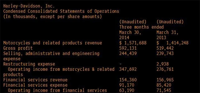 Zisk na akcii činil 1,21 dolaru. Analytici dotazovaní agenturou Thomson Reuters očekávali v průměru zisk 1,08 dolaru na akcii. Příjmy se v období leden až březen zvýšily o 10,2 % na 1,73 miliardy USD. Z toho příjmy z prodeje motocyklů vzrostly o 13,1 % a z prodeje součástek a doplňků o 7,7 %. Dodávky motocyklů obchodníkům a distributorům stouply o 7,3 % na 80 682 motocyklů.
