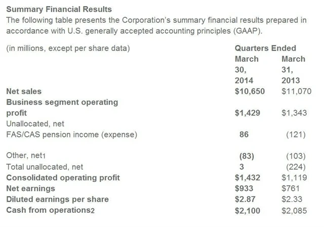 Výsledky Lockheed Martin v 1Q2014: Zisk na akcii 2,87 USD (odhad: 2,53 USD), tržby: 10,65 miliardy USD (odhad: 10,89 miliardy USD)