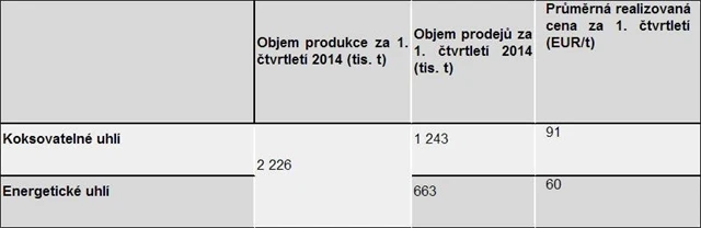Společnost v roce 2014 očekává produkci a prodej uhlí v rozmezí 9 až 9,5 milionu tun, přičemž podíl koksovatelného uhlí v prodejním mixu by měl činit 55 až 60 %. Průměrná nasmlouvaná cena koksovatelného uhlí pro dodávky ve druhém čtvrtletí roku 2014 je 85 EUR za tunu, což znamená 6% pokles oproti ceně realizované v prvním čtvrtletí 2014.