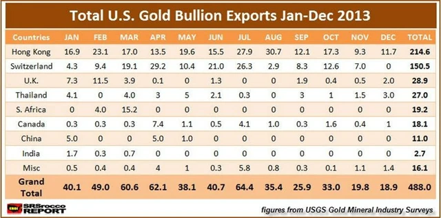 V loňském roce vyvezly Spojené státy do Hongkongu celkem 215 metrických tun zlatých cihel. Daleko za ním se umístil druhý příjemce - Švýcarsko - se 150 tunami. Následující tabulka ukazuje americký vývoz cihel drahého kovu v roce 2013.