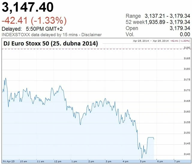 Evropské akcie v pátek ztrácely, za celý týden ale uzavřely nejednotně. Investoři v předchozích dnech zvažovali čtvrtletní hospodářské výsledky vybraných podniků a vývoj situace na východě Ukrajiny. Obchodní týden byl o den kratší, v pondělí zůstaly evropské trhy kvůli Velikonocům zavřené. Index EuroStoxx 50 za předcházející čtyři dny klesl, benchmark Stoxx Europe 600 se ale dokázal udržet v zelených číslech.