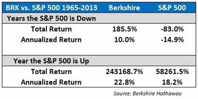 Hodně se toho napsalo o tom, že Warren Buffett v uplynulých pěti letech býčího trhu hned čtyřikrát "prohrál" se svým portfoliem souboj s širokým akciovým indexem S&P 500. Jak ve výroční zprávě svého fondu Berkshire Hathaway sám Buffett vypočítává, v letech, kdy index rostl, ho překonal od 60. let v průměru jen mírně. Buffettovo mistrovství v řízení portfolia ale ukazují roky, kdy S&P 500 klesal.