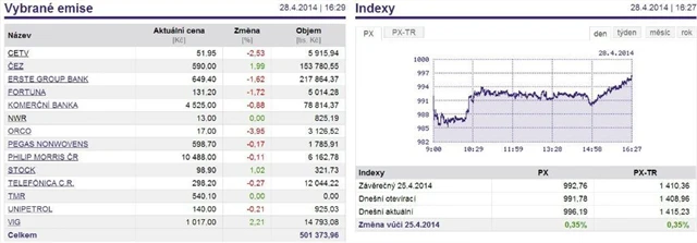 Index PX v pondělí posílil o 0,35 % na 996,19 bodu.