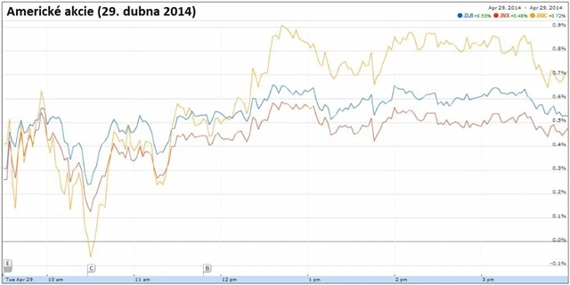 Zdražily i akcie cestovatelského serveru TripAdvisor (+4,59 %), který své kvartální finanční výsledky zveřejní ve čtvrtek (analytici očekávají, že společnost vykáže zisk na akcii 0,55 USD), nebo na NYSE obchodované akcie finské společnosti Nokia (+5,69 %). Podnik, z jehož struktury na konci minulého týdne definitivně vypadla divize výroby mobilních telefonů, v úterý ve snaze udržet si zájem investorů oznámil, že za loňský rok vyplatí miliardu eur na mimořádných dividendách a zahájí zpětný odkup vlastních akcií v hodnotě 1,25 miliardy eur.