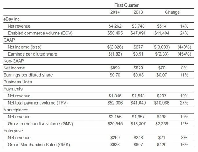 - Výsledky eBay v 1Q2014: Upravený zisk na akcii 0,70 USD (odhad: 0,67 USD), tržby 4,26 miliardy USD.