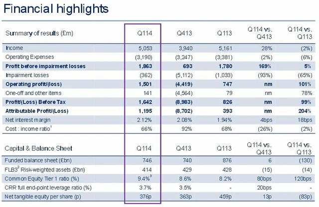 V loňském prvním čtvrtletí dosahoval zisk připadající držitelům kmenových akcií 393 milionů liber. Analytici v anketě agentury Reuters předpokládali, že za první tři měsíce letošního roku zisk dosáhne jen 200 milionů liber. Provozní zisk se zvýšil dvojnásobně na 1,501 miliardy liber a také překonal odhady.