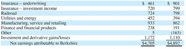 Zisk klíčové pojišťovací divize, kam patří pojišťovny General Reinsurance, Geico a další, klesl na 461 milionů USD, zhruba polovinu úrovně dosažené před rokem. Ziskovost snížily odpis některých pojistek a ztráta související s pohybem směnných kurzů.