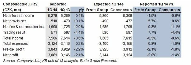 "Z našeho pohledu zaostala čísla za 1Q2014 mírně za odhady. Znovu vzrostl poměr nesplácených půjček. Čisté úrokové výnosy a výnosy z poplatků a provizí byly slabší než očekávání. Na druhou stranu provozní náklady byly v souladu s odhady," komentoval výsledky Günter Hohberger, analytik z Erste Group Bank.