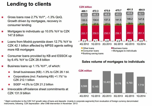 V segmentu úvěrů občanům narostlo portfolio hypoték meziročně o 10 % na 147,8 miliardy Kč. Tento růst byl částečně kompenzován nižší poptávkou po úvěrech ze stavebního spoření, objem úvěrů poskytnutých Modrou pyramidou poklesl o 12,7 % na 42,1 miliardy Kč.