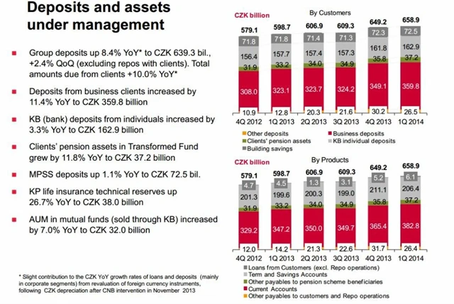Komerční bance v prvním čtvrtletí klesl konsolidovaný čistý zisk připadající na akcionáře meziročně o 2,1 % na 3,1 miliardy korun. Objem aktiv skupiny vzrostl o 0,6 % na 870 miliard korun. Objem úvěrů poskytnutých klientům vzrostl o 2,7 % na 484,9 miliardy korun. Objem vkladů se zvýšil o 8,4 % na 639,3 miliardy korun.