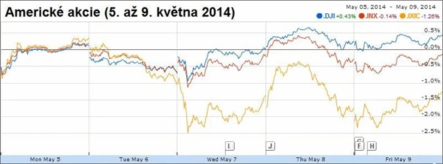 Postupný růst během dne dostal všechny tři hlavní akciové indexy do kladného teritoria. Dow nakonec připsal 0,2 % na 16 583,34 bodu, S&P 500 přidal 0,15 % na 1 878,48 bodu a Nasdaq posílil o 0,5 % na 4 071,87 bodu. Za celý týden se udržel v plusu pouze Dow (+0,43 %), S&P 500 odepsal 0,14 % a Nasdaq 1,26 %.