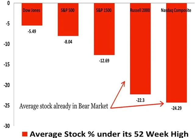 Indexu S&P 500 se v týdnu opět nepodařilo zaútočit na dubnové rekordy. Analytici upozorňují na to, že na trhu stále více titulů padá hlouběji pod svá 52týdenní maxima, ačkoli index velkých firem S&P 500 je stále jen zhruba procento pod maximem. Je to typické pro vrcholy býčích trhů, kdy největší firmy dále na burze posilují, zatímco menší a volatilnější tituly začínají ztrácet. Průměrná akcie z indexů Nasdaq nebo Russell 2000 již vstoupila do medvědího trhu.