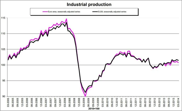 Průmyslová výroba v eurozóně v březnu klesla o 0,3 % meziměsíčně a o 0,1 % meziročně. Meziměsíční pokles se očekával, meziročně však analytici vyhlíželi 0,9% růst. V celé evropské osmadvacítce v březnu průmyslová produkce klesla o 0,2 % oproti únoru a vůči březnu 2013 se o 0,5 % zvýšila.