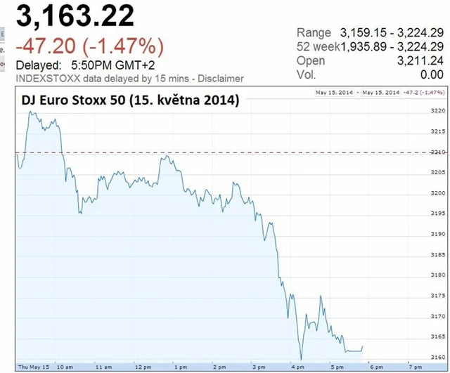 Evropské akcie ve čtvrtek uzavřely v mínusu poté, co z eurozóny přišla slabší čísla o vývoji hrubého domácího produktu. Podle zprávy zveřejněné statistickým úřadem Eurostat vzrostl HDP eurozóny v prvním kvartále o 0,9 %, zatímco odhady počítaly se silnějším růstem o 1,1 %. Náladu investorů nedokázala zvrátit ani druhá zpráva, podle které v dubnu inflace v zemích platících eurem zrychlila v souladu s odhady na 0,7 %.