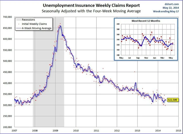 Týdenní počet nových žádostí o podporu v nezaměstnanosti ve Spojených státech v týdnu do 17. května vzrostl o 28 tisíc na 326 tisíc (odhad: 310 tisíc) z 298 tisíc v předchozím týdnu (revidováno z 297 tisíc). Počet pokračujících žádostí v týdnu do 10. května klesl na 2,653 milionu z 2,666 milionu (revidováno z 2,667 milionu), očekával se růst na 2,670 milionu. Čtyřtýdenní průměr klesl o jeden tisíc na 322 500. (22. 5. 2014)
