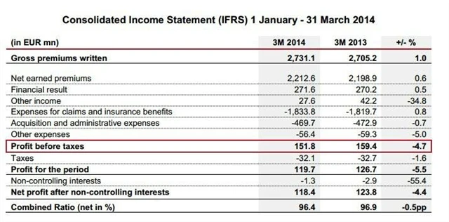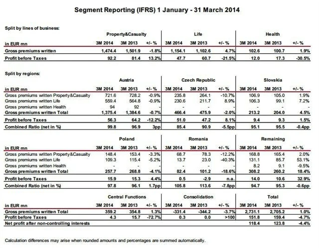 VIG výsledky za první kvartál nezklamala. Zisk před zdaněním firmě sice klesl meziročně o 4,7 % na 152 milionů EUR, trh však očekával pokles na 146 milionů EUR. Hrubé předepsané pojistné vzrostlo o procento (po očištění o 2,9 %) na 2,73 miliardy EUR, což bylo v souladu s odhady.