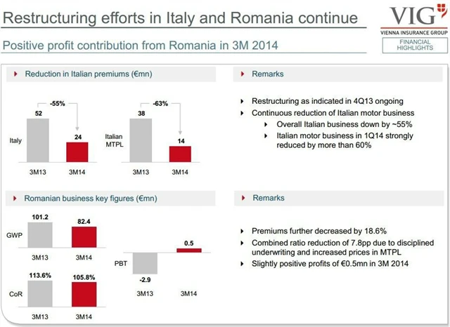Podle skupiny se už objevily náznaky zlepšení v problémových rumunských částech skupiny, kde probíhají restrukturalizační opatření. Rumunsko se tak vrátilo do mírného zisku 0,5 milionu EUR. Hrubé předepsané pojistné v Rumunsku a Itálii však dále kleslo.