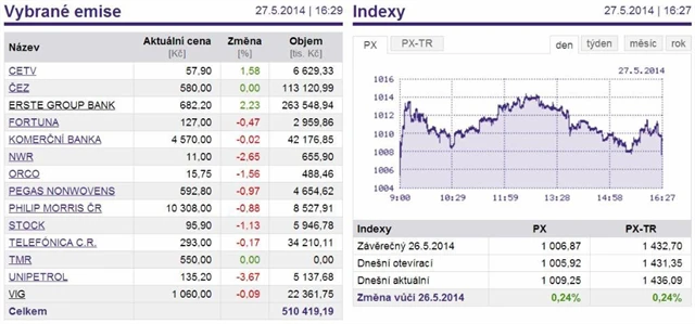 Index PX v úterý vzrostl již počtvrté v radě, tentokrát o 0,24 % na 1 009,25 bodu.