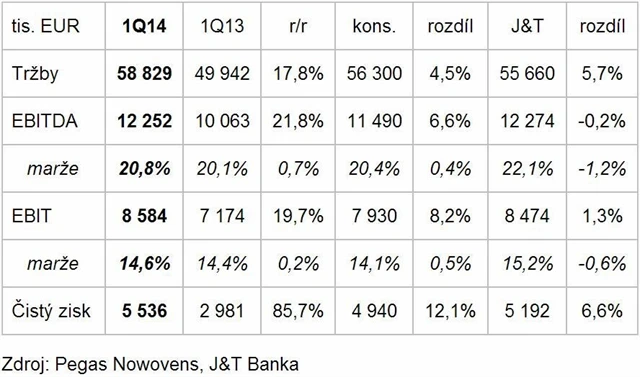 Čistý zisk výrobce netkaných textilií Pegas Nonwovens v prvním čtvrtletí 2014 narostl meziročně o 85,7 % na zhruba 5,5 milionu z loňských 3 milionů EUR. Tržby Pegasu dosáhly v prvním kvartálu 58,8 milionu EUR (odhad: 56,58 milionu EUR, 1Q2013: 49,9 milionu EUR), meziročně tedy narostly o 17,8 %.