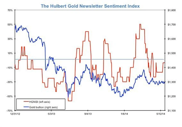 Koncem června 2013 indikátor klesl na -56,7 % a v prosinci na -36,7 %. Každé z těchto čísel odpovídalo daleko pesimističtějšímu sentimentu ve srovnání se současností a přesně podle očekávání kontrariánů se následně zlato v obou případech vzchopilo - o 19 % po červnovém minimu a o 16 % po tom prosincovém. Další udržitelnou rally tak lze čekat ve chvíli, kdy indikátor klesne aspoň k prosincovému minimu.