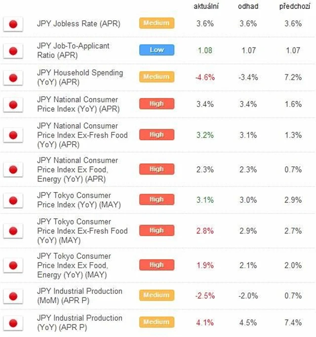Po dubnovém zvýšení daní byla v Japonsku citelně zasažena spotřeba domácností (-4,6 %), průmyslová výroba nečekaně klesla (-2,5 % meziměsíčně), nezaměstnanost zůstala stabilní na 3,6 % a inflace vzrostla v souladu s odhady.