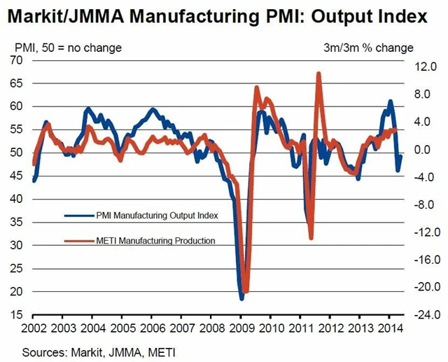 Průmyslová aktivita v Japonsku v květnu opět klesla, i když velice mírně. Výroba a nové objednávky klesly pomaleji než v dubnu, pokračoval nepřesvědčivý výkon exportu. Růst indexu ale naznačuje stablizaci celého sektoru.