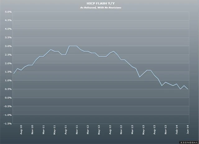 Analytici v anketě agentury Reuters v průměru očekávali, že inflace v květnu zůstane na 0,7 %, podle Bloombergu se čekal pokles na +0,6 %. Inflace je hluboko pod 2% hranicí, kterou si jako strop cenové stability stanovila ECB, i pod úrovní jednoho procenta, kterou ECB označila za "nebezpečnou zónu".