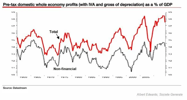 Známý medvěd Albert Edwards ze Société Générale přitom varuje, že ziskové marže (zisky v ekonomice v poměru k HDP) právě začaly klesat, což považuje za důkaz toho, že jejich současná výše udržitelná není. "Investoři si při zveřejnění revize růstu amerického HDP v 1Q2014 opomněli všimnout jednoho čísla. Jde o 10% meziroční pokles v kolonce zisků v ekonomice. Vysvětlením je to, že ziskové marže začaly klesat a vstoupily do poklesové fáze cyklu," říká Edwards.