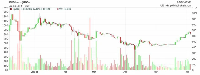 Po prudkém růstu až nad 1 200 USD se ceny bitcoinu propadly v dubnu až ke 360 USD za jeden. Od té doby však v tichosti znovu vzrostly až na 660 USD.