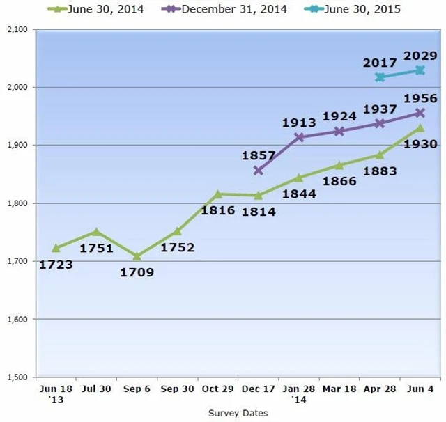 Graf ukazuje, jak se postupně zvyšovala průměrná odhadovaná hodnota indexu S&P 500 pro konec letošního června. Za rok by měl podle analytiků index dokonce "parkovat" nad hranicí 2 000 bodů. Ale pokud nepřijde zásadnější propad trhu, lze s vysokou mírou pravděpodobnosti předpokládat, že za pár měsíců bude očekávaná úroveň ještě daleko vyšší. Ovšem je potřeba dodat, že ačkoli bychom to možná mnozí chtěli - omluva všem natěšeným "shortařům" -, trh donekonečna růst nemůže.