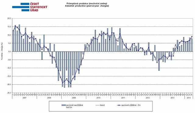 Průmyslová výroba v České republice v dubnu dál rostla. Meziročně výroba průmyslových podniků vzrostla o 7,7 %. To je sice oproti březnovému tempu růstu pokles o 0,7 procentního bodu, expanze je však stále velmi silná.