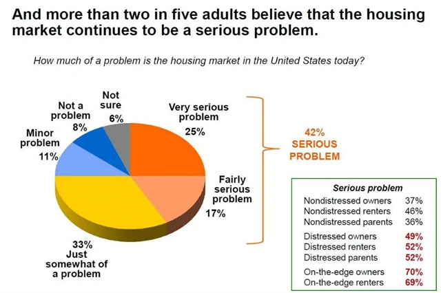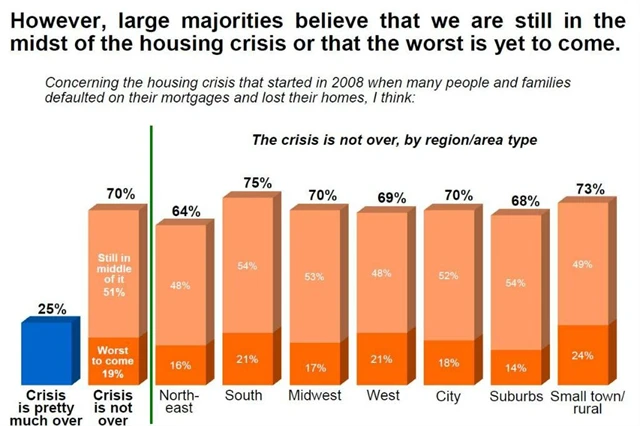 Obavy Američanů dokládá i jejich pohled na samotný realitní trh. Tři čtvrtiny obyvatel USA se domnívají, že je pro stabilitu americké ekonomiky realitní trh stále velkou hrozbou. Rovných 25 % mužů a žen dokonce tvrdí, že se nadále jedná o "zásadní problém". Jako překonané vidí problémy trhu s nemovitostmi jen 8 % lidí. Dalších 11 % se domnívá, že rizika plynoucí z realitního trhu přetrvávají, ale jsou pro americkou ekonomiku málo významná.