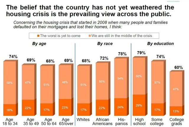 Napříč demografickými třídami jsou vůbec největšími pesimisty lidé ve věku 18 až 34 let, Američané hispánského původu a středoškolsky vzdělaná populace. Relativně optimisticky naopak budoucnost vidí absolventi vysokých škol, i když i v jejich případě převažuje počet těch, kdo se domnívají, že se Spojené státy z následků hypoteční krize z roku 2007 ještě úplně nevymanily.