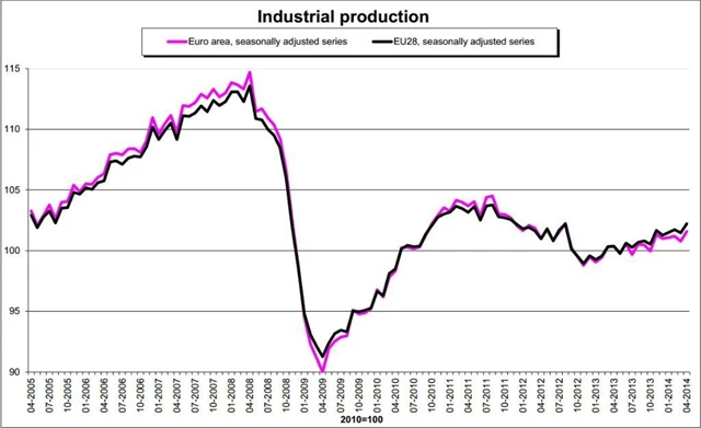 Průmyslová produkce v eurozóně v dubnu vzrostla meziměsíčně o 0,8 %, přestože trh predikoval jen 0,5% růst. Meziročně se zvýšila o 1,4 %, ačkoli se očekávalo +0,9 %. (12. 6. 2014)